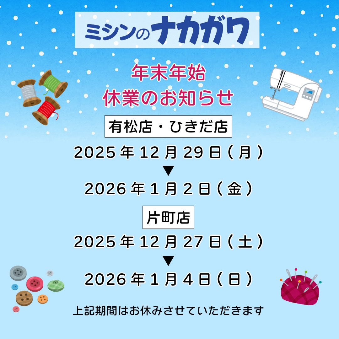 年末年始の営業について 有松、ひきだ店は 12月29日(月)~1月2日(金)までお休みいただきます。 片町店は 12月27日(土)~1月4日(日)までお休みをいただきます。 なお1月3日(土)10時より 新春初売りセールを開催いたします! ご迷惑をおかけいたしますがよろしくお願いいたします。