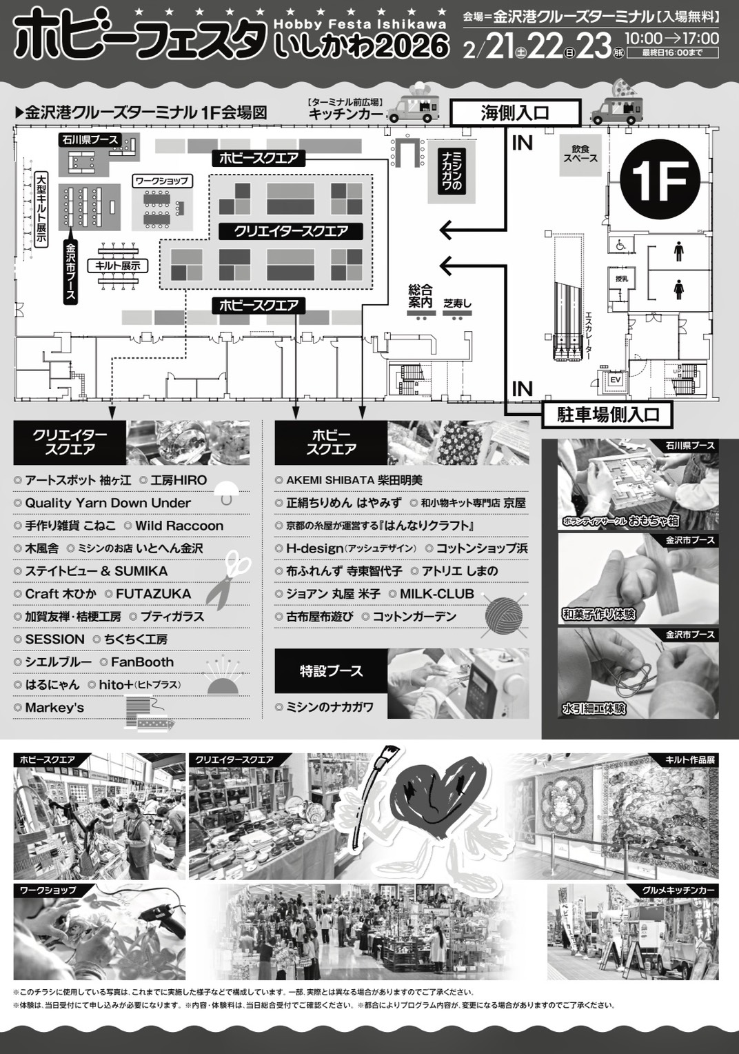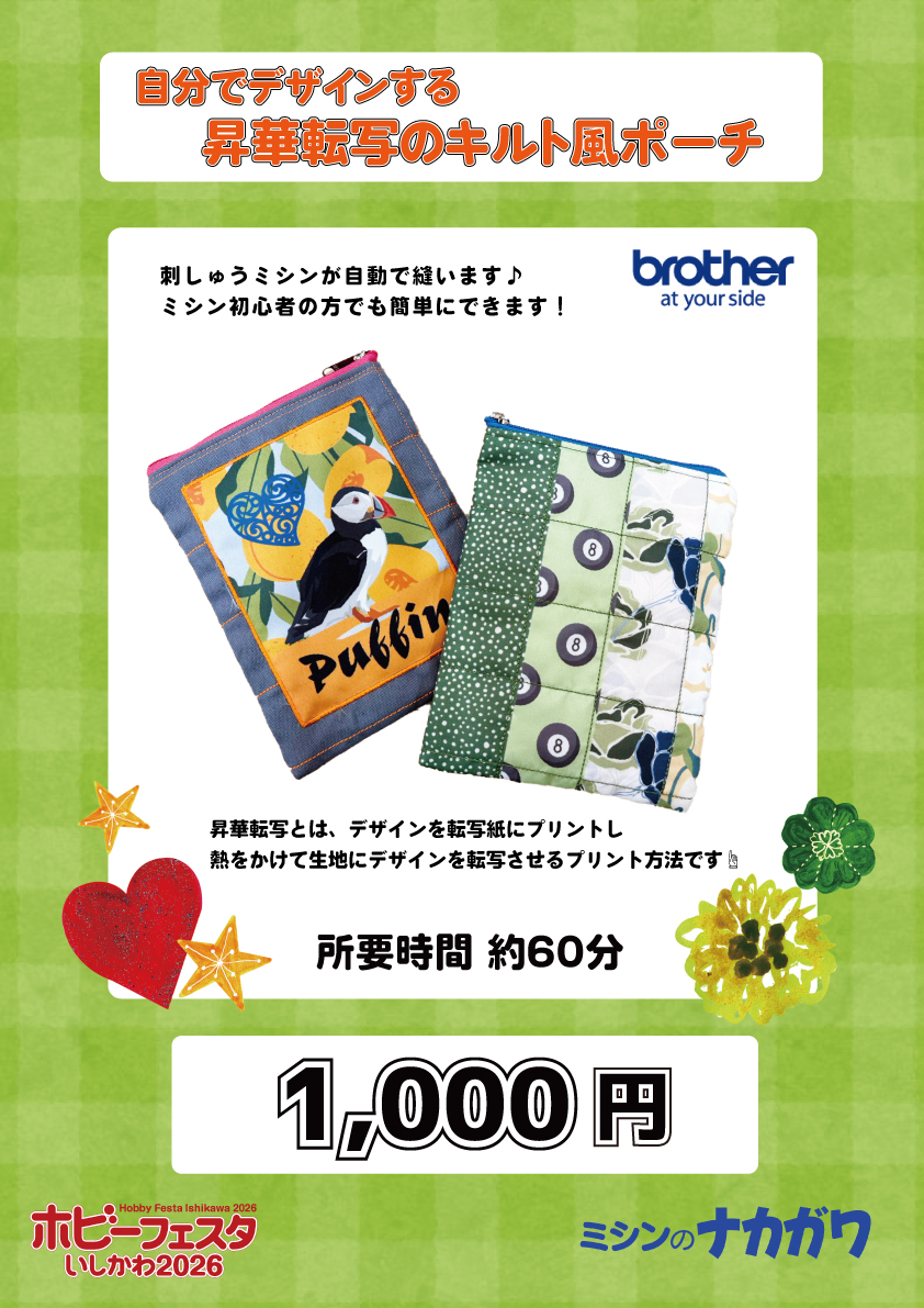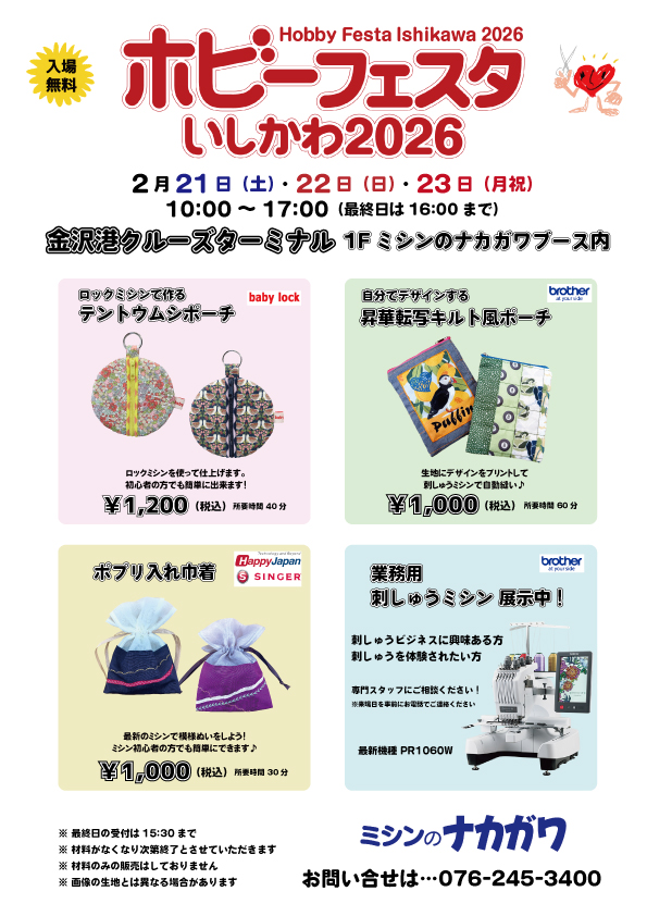 最新のミシン、ロックミシン体験、業務用刺しゅうミシンの展示等予定しております。