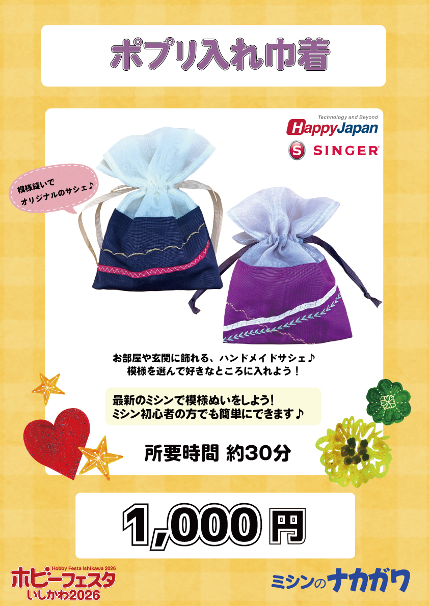 刺しゅうミシンで作る「ポプリ入れ巾着」