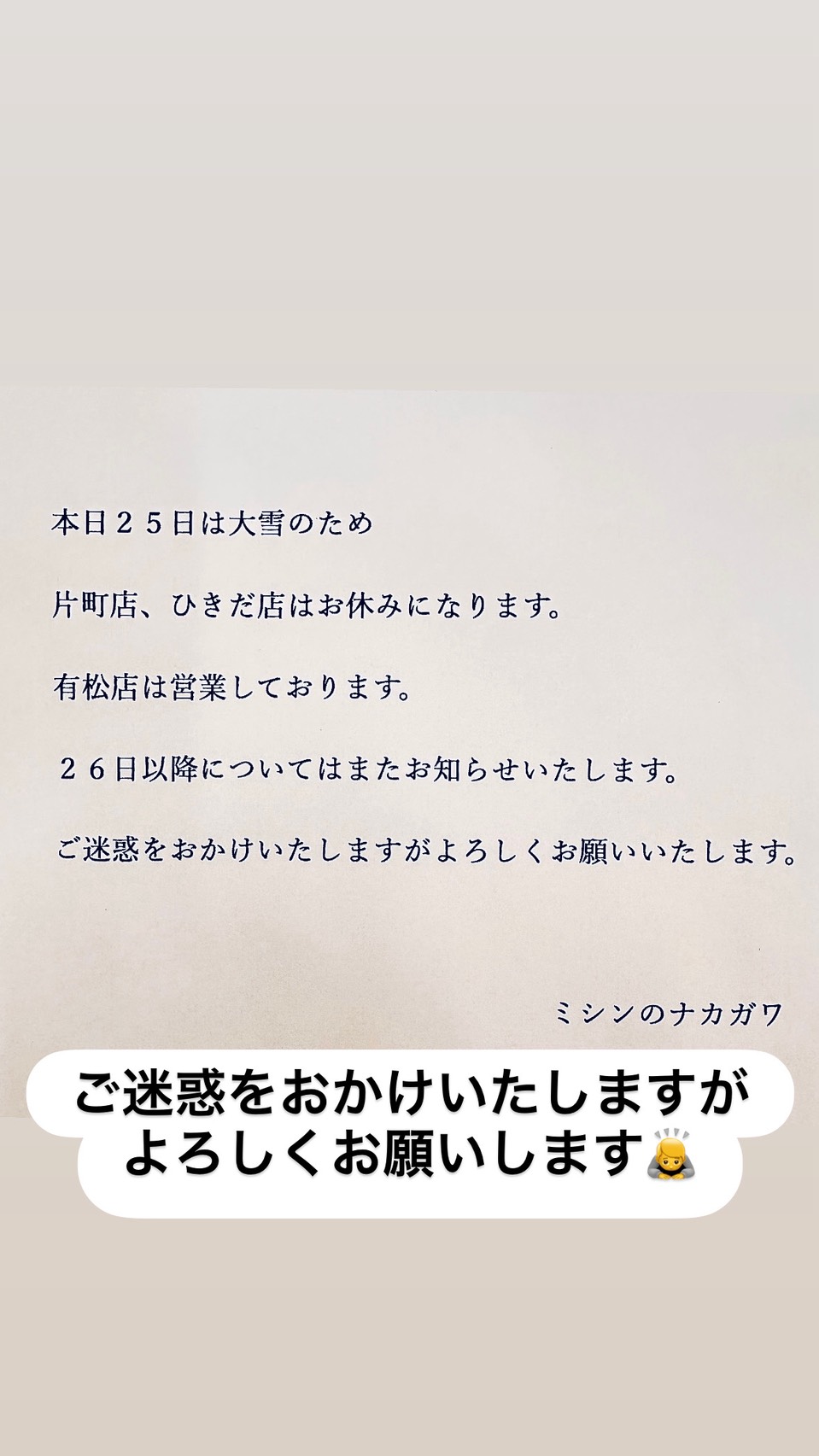 本日1月25日は大雪のため ひきだ店、片町店はお休みいたします。 なお有松店は17時まで営業しております。 何かありましたらお電話でご確認の上 お越しください。 ご迷惑をおかけいたしますがよろしくお願いいたします。 店主