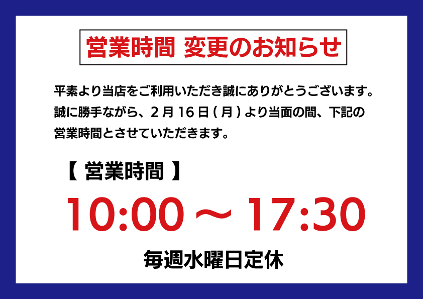 2月16日よりひきだ店の営業時間が変更になります。 10:00~18:00 ↓ 10:00~17:30に変更になります。 なお片町店、有松店は変更はありません。 ご迷惑をおかけいたしますがよろしくお願いいたします。